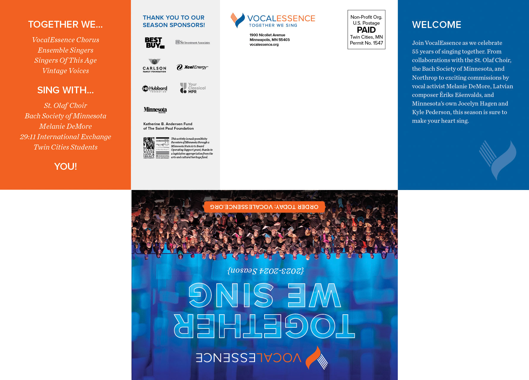 This small t-cross folding self mailer announced the 2023-24 VocalEssence season. The compact size served as an economical way to announce the new season with fun, eye-catching reveal panels. The design look and feel of this announcement also set the design direction for all the other marketing pieces throughout the season, such as postcards, posters, web graphics and concert programs.